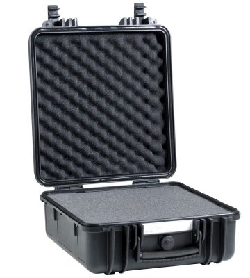 The Explorer Cases 2437 is a rugged basket-shaped case rated for drops up to 9 meters, featuring a top handle, automatic valves, and a pull latch. Available in three colors, it comes empty or with pre-cubed foam and includes a shoulder-strap attachment point.