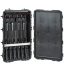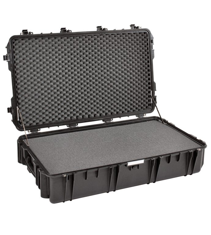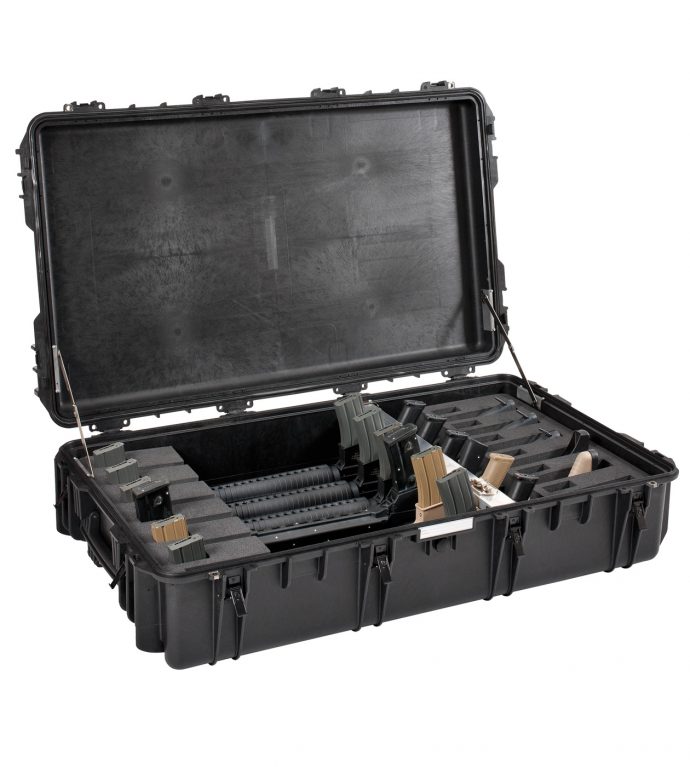 Multi-weapons transport cases. Metal butterfly latches (on certain models). Available in 5 standard internal configurations. Self oiling free running wheels. Combination latch (optional).