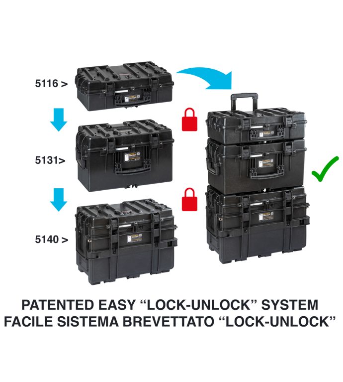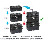 The new 5116 and 5131 models can be stacked with each other and/or on top of the Explorer 5140, the popular tool chest with drawers, creating a mobile workstation with even greater loading capacity for tools, spare parts and large components, also sharing with the latter its trolley system with wheels and telescopic handle.