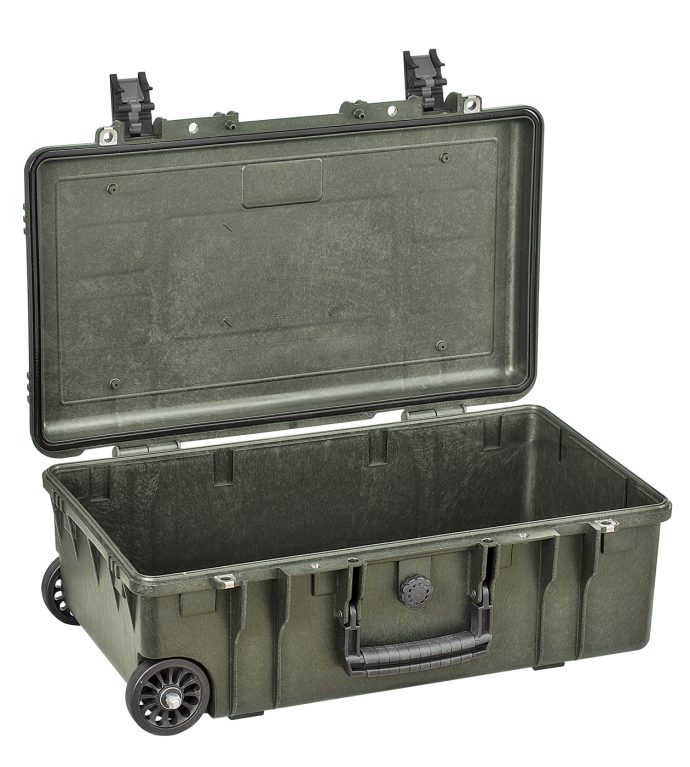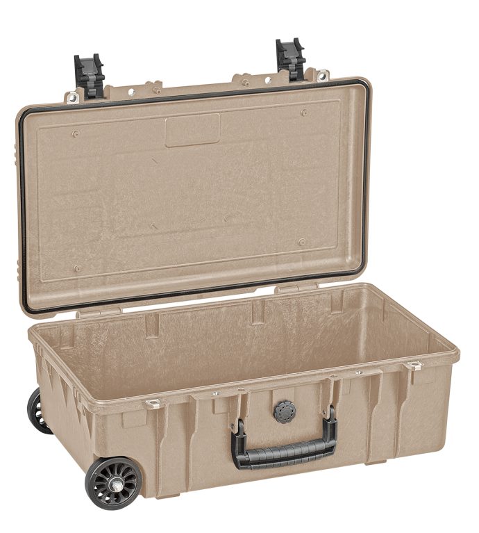 Heavy duty cases with wheels with ball bearings and telescopic handle. Sealing o-ring and removable lid. Available empty or with layers of pre-cubed foam in the bottom and convoluted foam in the lid.