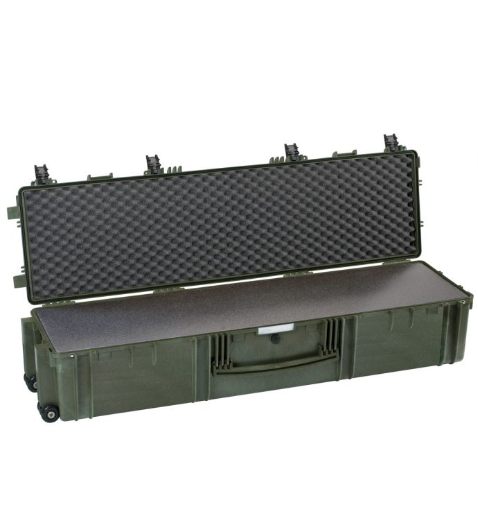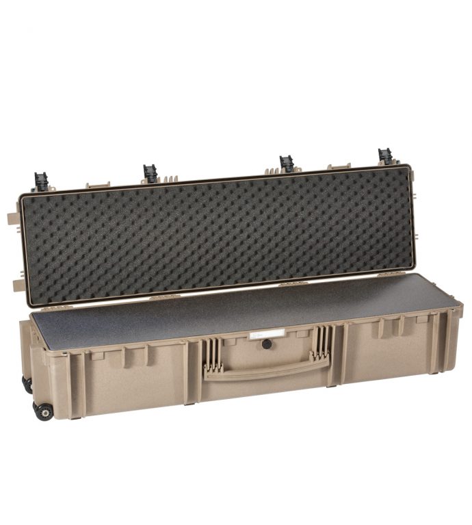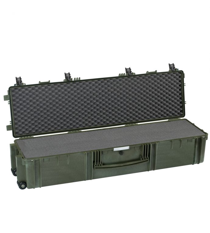 Maletas herméticas espaciosas para rifles e instrumentos largos. Interior adaptable con espuma precortada. Nato stock number (NSN) disponible bajo petición. Seis ruedas con cojinetes de bola y puntos de montaje reforzados en metal para candados.