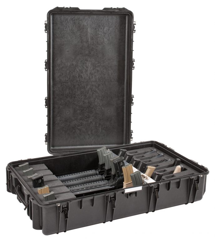 Grandes valises pour le transport de plusieurs fusils. Serrures métalliques avec crochet papillon. Disponibles dans 5 configurations standards. Roues autolubrifiantes. Serrures à combinaison disponibles sur demande.